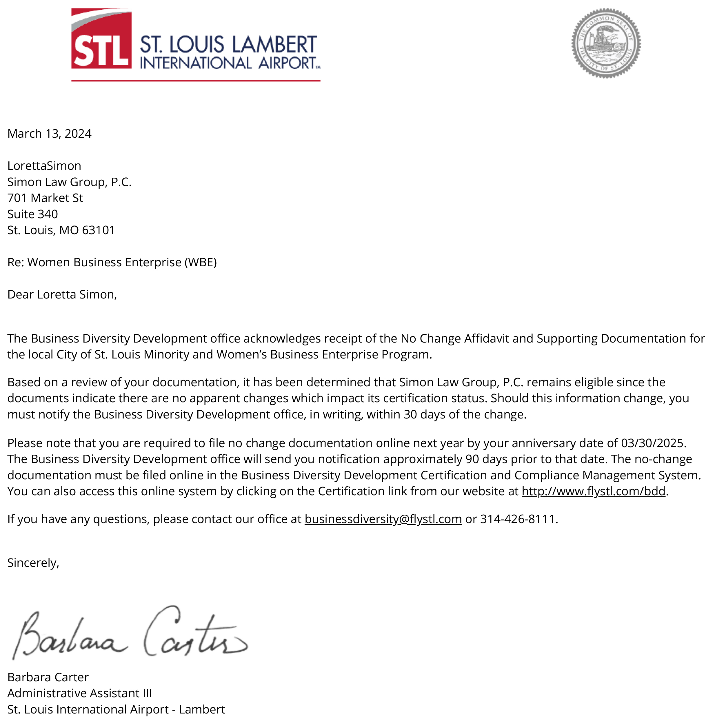 Simon Anderson Law P.C. is certified as a Women's Business Enterprise by the City of St. Louis Airport Authority.